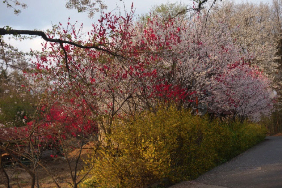 それから2週間真原桜街道では桜はもう散りかかり色あせ、紅白の桃の花が爛漫と 黄色い花は何 山吹?